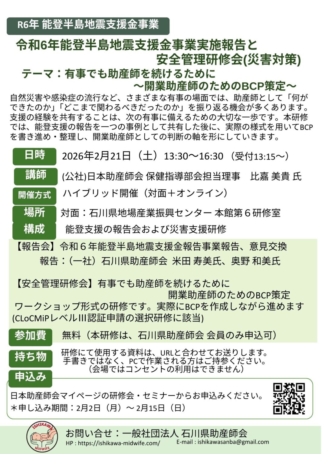 研修会:安全管理研修(災害対策):有事でも助産師を続けるために 〜開業助産師のBCP作成〜